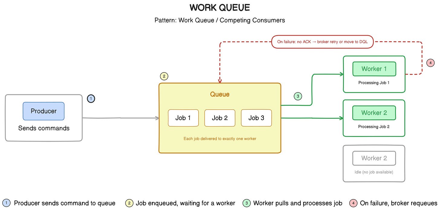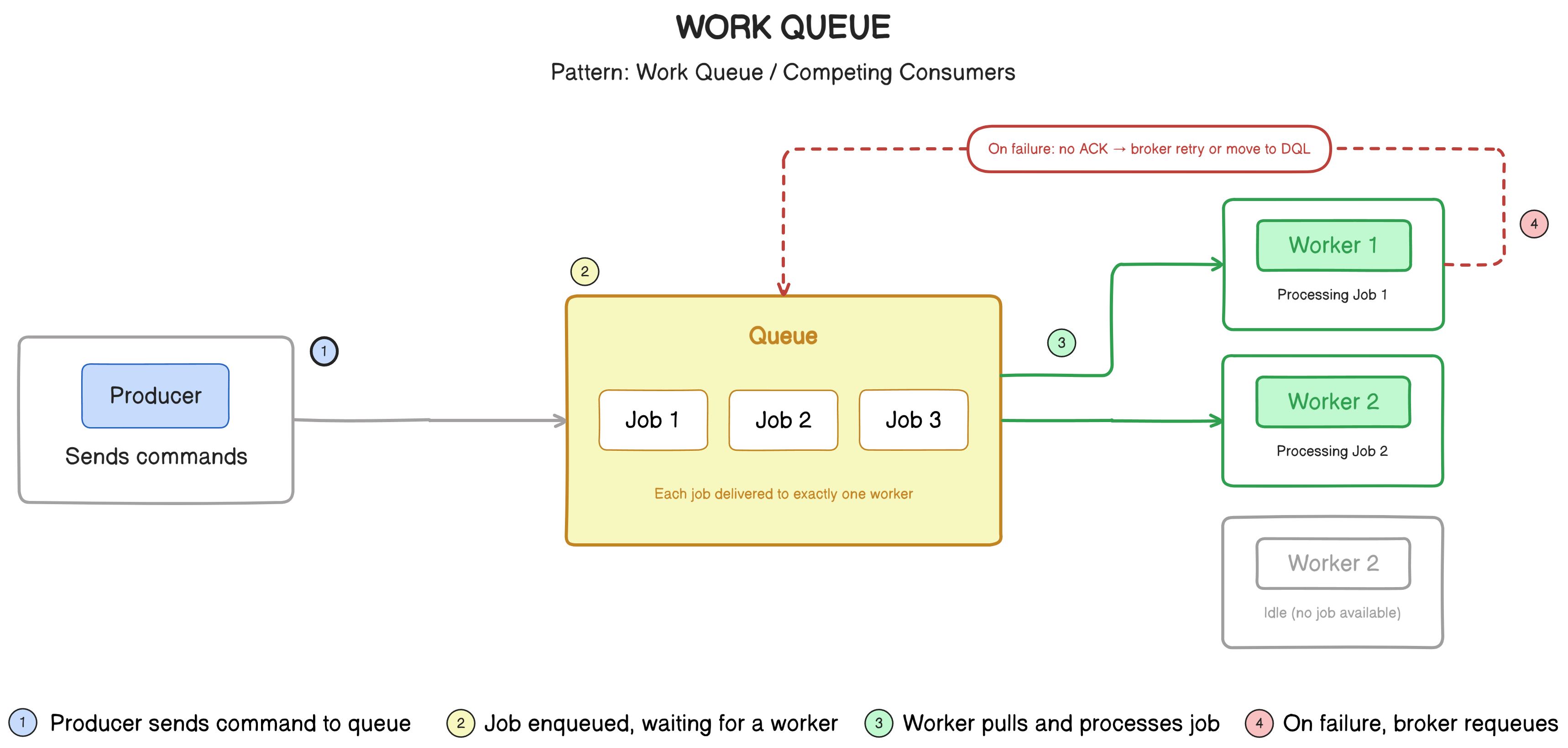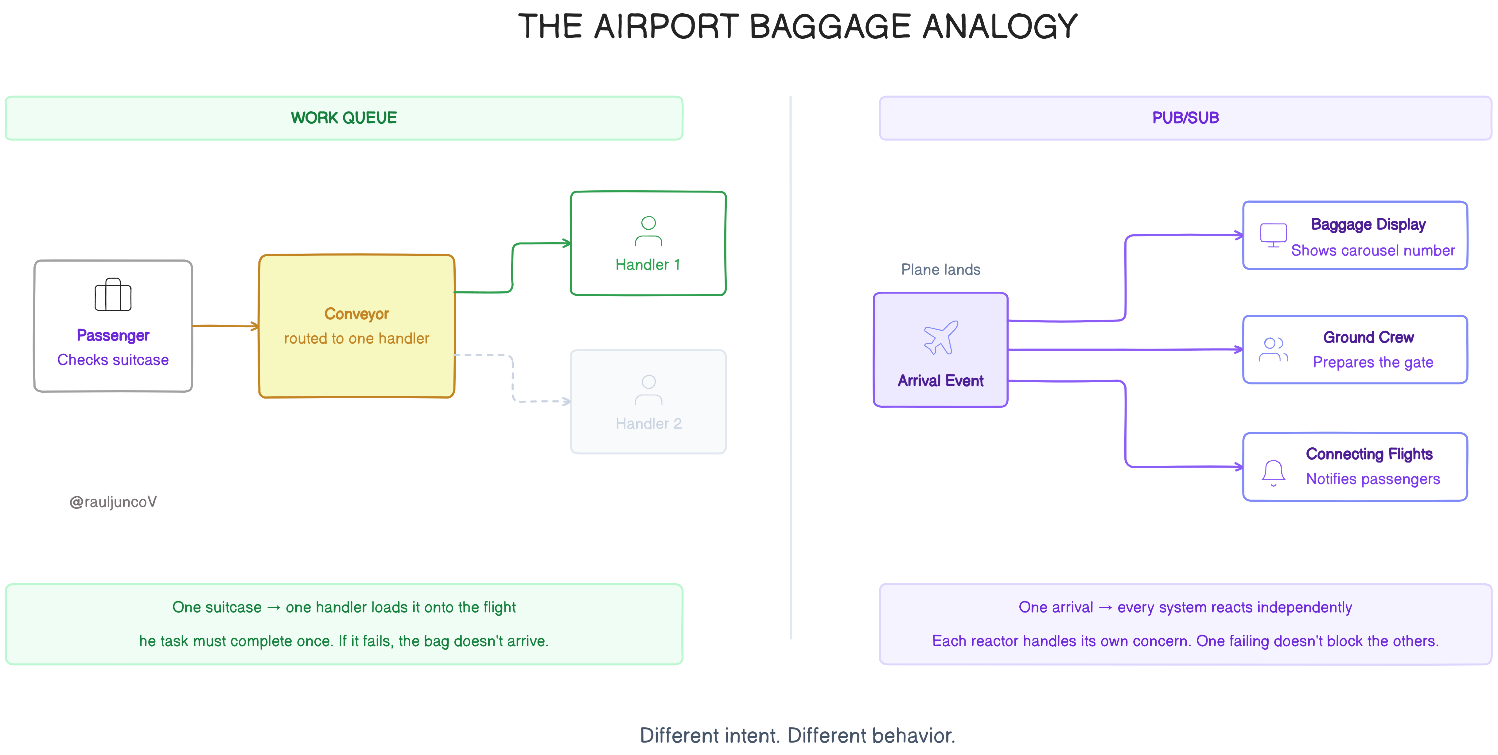 When you check a suitcase, it is routed to one handler who loads it onto your flight. That’s a work queue. The task must be completed once, and if it fails, your bag doesn’t arrive.