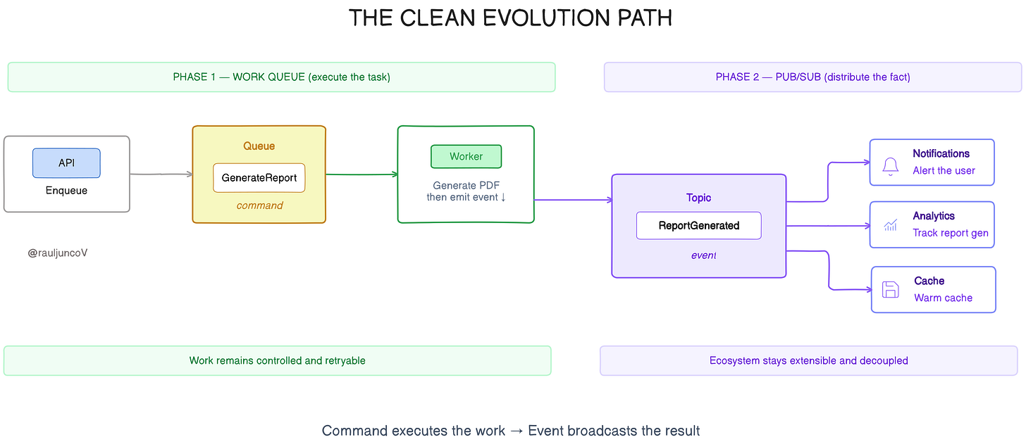 Now other systems can react, notifications, analytics, auditing, and caching, without coupling themselves to the report service.