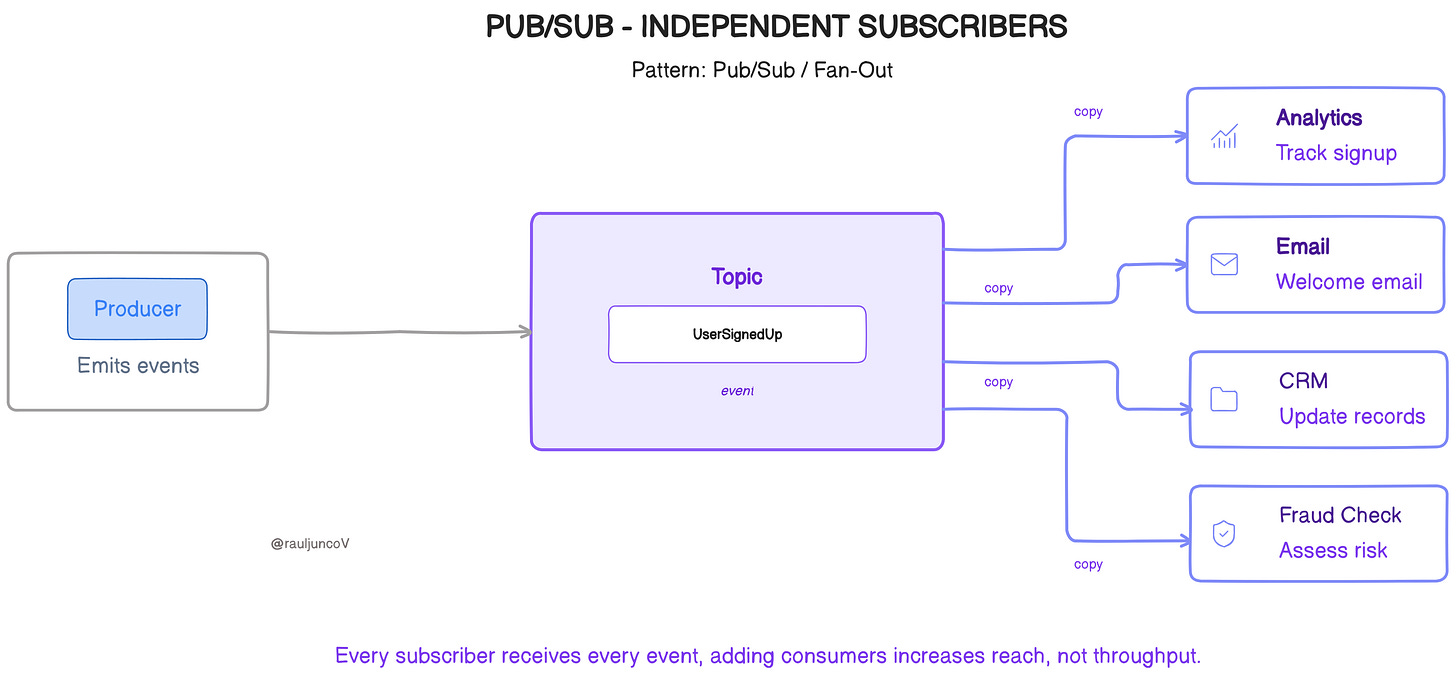 When an event occurs, multiple systems may react independently. Each subscriber receives its own copy. One subscriber failing does not block the others.