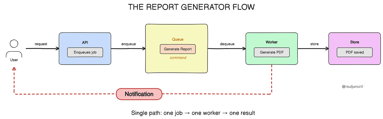 Think about generating a PDF, sending an email receipt, or resizing images. You don’t want five services doing the same work. You want the work done once, reliably.