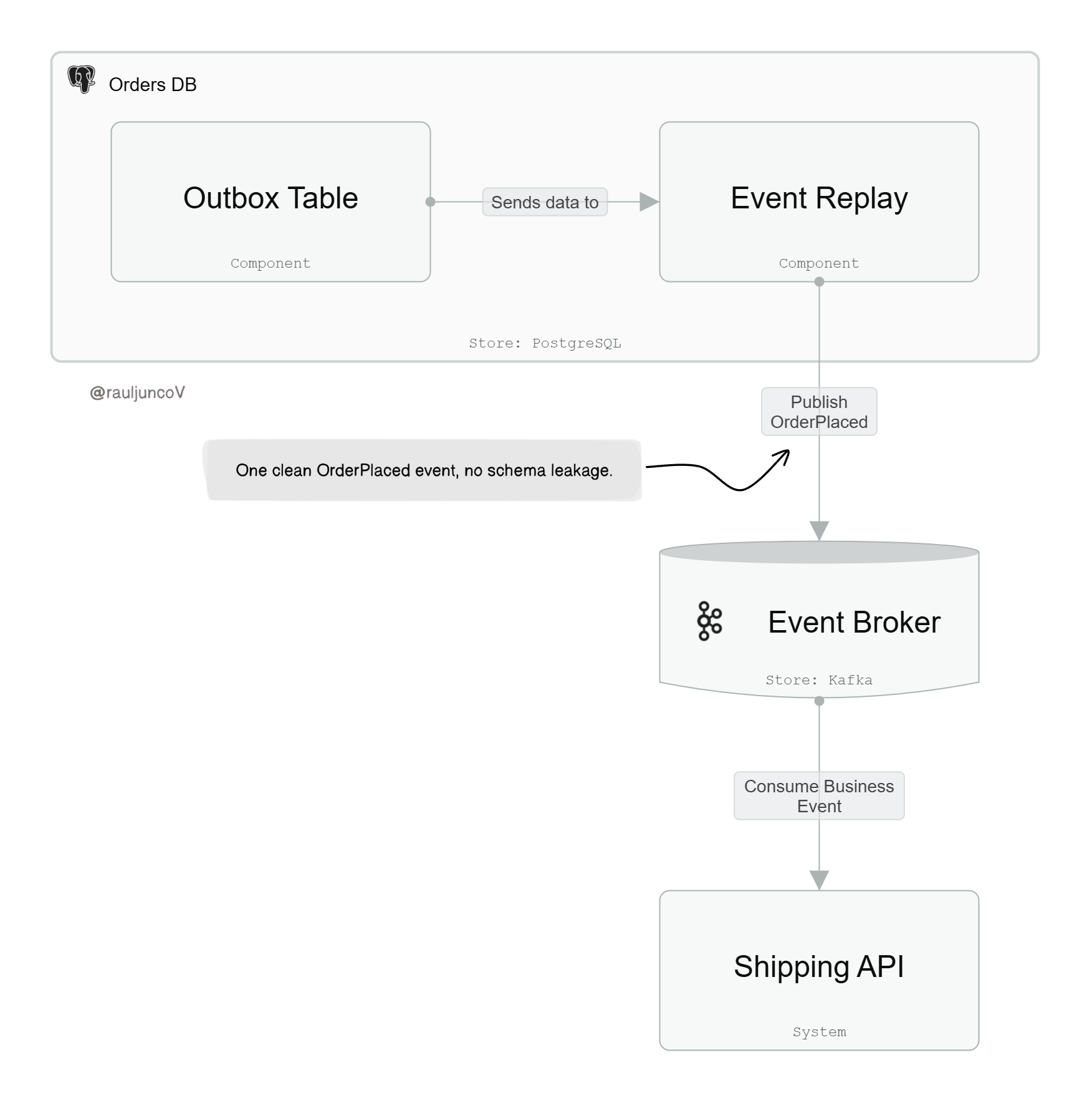 Instead of exposing table changes, the producer writes business events into an outbox table as part of its transaction. A relay process then publishes them to the event bus.
