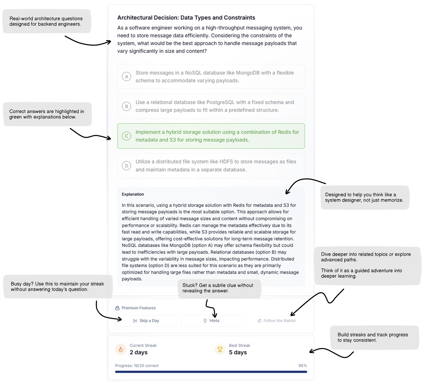 Every day, you get a system design problem that forces you to think, research, and sharpen your instincts.