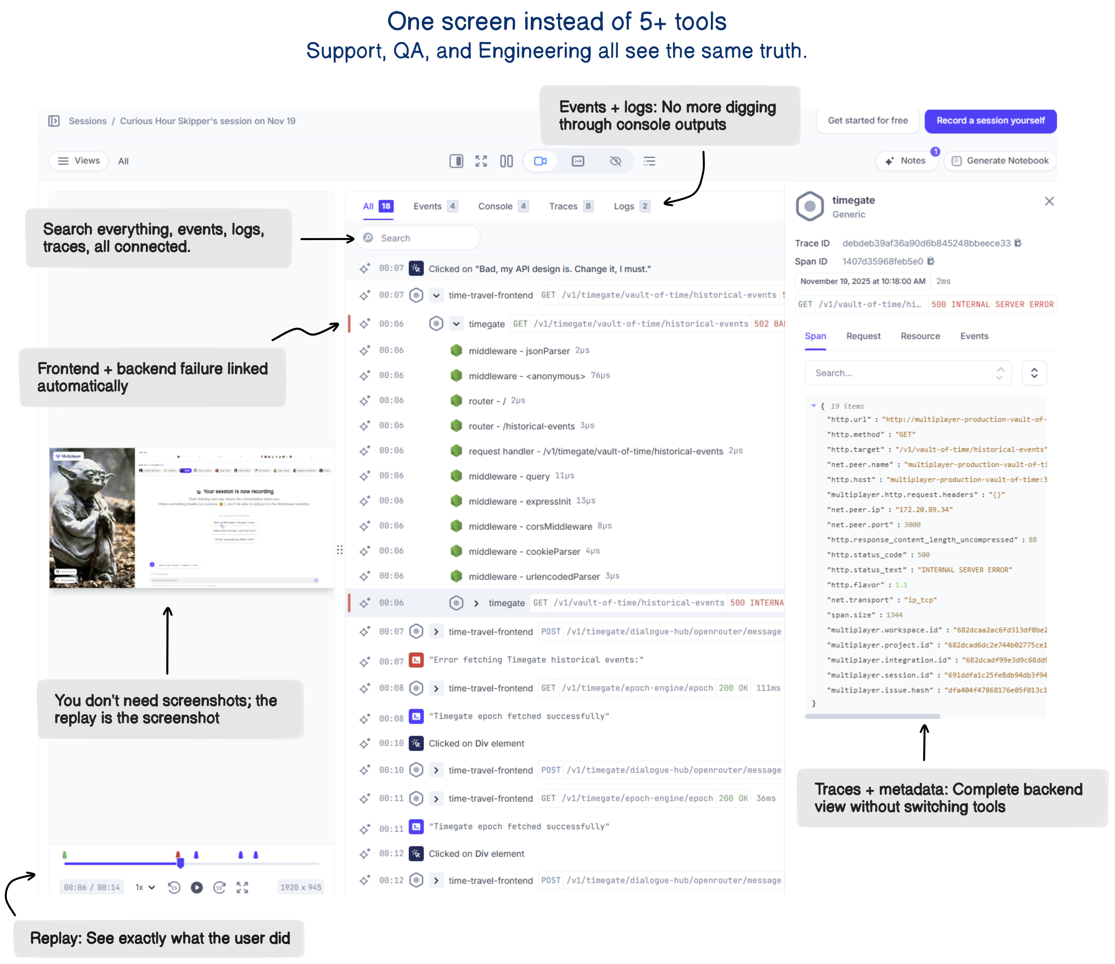 It records user actions, frontend state, network calls, backend traces, logs, and request/response data, all stitched into one connected timeline: