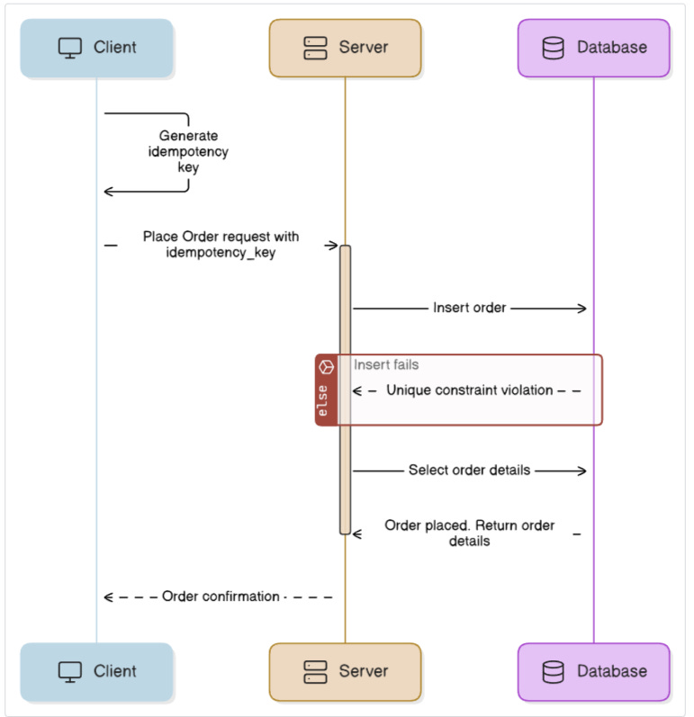The server attempts to insert the order using this key. If the same request is retried (e.g. due to a timeout), the database will reject the duplicate with a constraint violation.