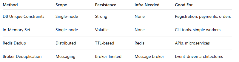 Combine layers (e.g., broker de-dup + Redis + DB constraint) for critical flows.