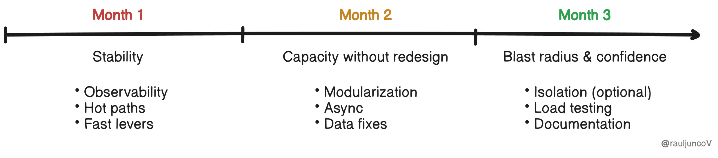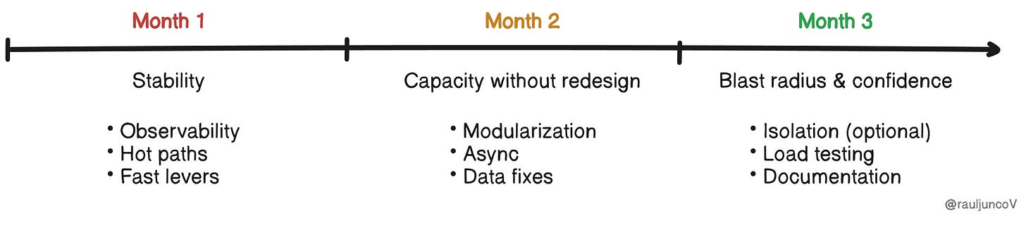 At this point, the system should be stable under peak load. Month 3 is about turning that stability into confidence and making future failures smaller, slower, and easier to manage.